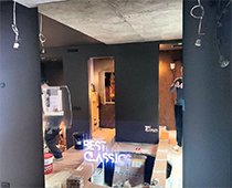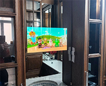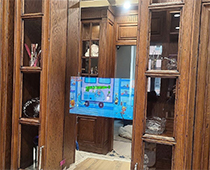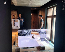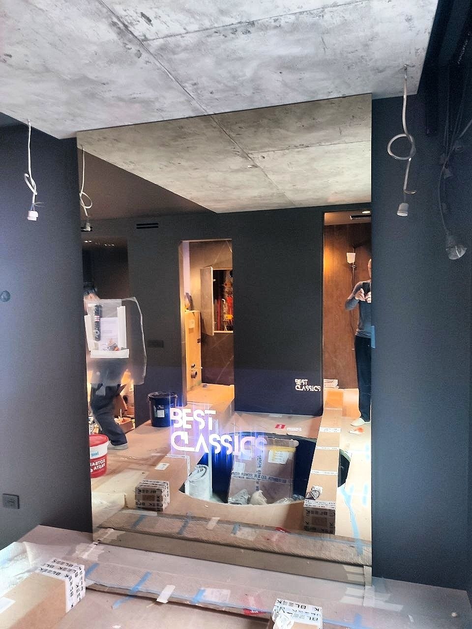 Использован экран с диагональю 22" и зеркало 1,5х1,5 метра. Отличительной особенностью инсталляции стало использование двух зеркальных плоскостей, разделенных металлической рамой.